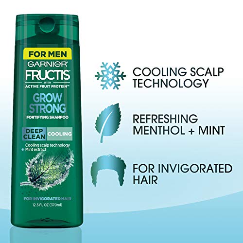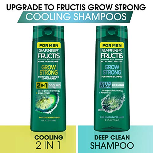 From the manufacturer Upgrade to Garnier Fructis Grow Strong Cooling Shampoos Fortifying shampoos with cooling scalp technology and refreshing menthol, Fructis Grow Strong Cooling Shampoos deliver a cooling sensation and long-lasting clean feel for healthier hair after every wash. Cooling 2in1 Shampoo and Conditioner formulated with Citrus Extract and Menthol gives you a cooling sensation for energized hair. Cooling Deep Clean Shampoo formulated with Mint Extract and Menthol gives you a cooling sensation for clean, invigorated hair. Formulas made with Active Fruit Protein, an exclusive combination of citrus protein, Vitamins B3 and B6, fruit and plant-derived extracts and strengthening conditioners for healthier, stronger hair. Vegan formula made with no animal derived ingredients or byproducts. Size:12.5 Fl Oz  |  Color:Grow Strong Cooling Shampoo Upgrade your hair care routine with new Garnier Fructis Grow Strong Cooling Deep Clean Shampoo for Men. Grow Strong Cooling Deep Clean Shampoo for Men is made with a cooling scalp technology and formulated with Mint Extract and Menthol to give you a cooling sensation for clean, invigorated hair. Grow Strong Deep Clean Shampoo for Men gives you your ultimate clean feel and fortifies for healthy hair after every wash. Fructis Grow Strong Shampoo and Conditioner formulas are paraben-free, vegan, with no animal derived ingredients or by-products and gentle enough for everyday use to clean and fortify hair. Formulas made with Active Fruit Protein, an exclusive combination of citrus protein, Vitamins B3 and B6, fruit and plant-derived extracts and strengthening conditioners for healthier, stronger hair. Upgrade your routine with Fructis Grow Strong Cooling Deep Clean Shampoo for Men.