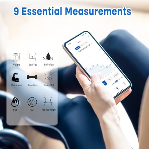 9 Essential Body Measurements: Body weight shows on the scale, other body composition data including weight, body fat, BMI, muscle mass, body water, bone mass, visceral fat, BMR and fat-free weight stored in the app.
