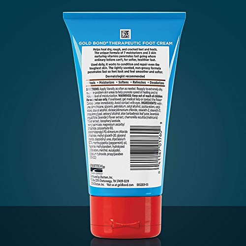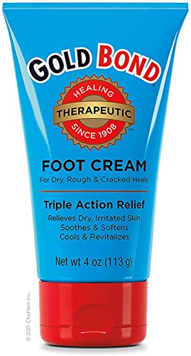 Gold Bond Therapeutic Foot Cream with Triple Action Relief, 4 oz. Get triple-action relief and moisturize, smooth, and soften your dry, rough feet and heels. You get 7 essential moisturizers and 3 nourishing vitamins that will soothe your feet. The vitamins in the formula include vitamin C to help protect against environmental stressors, vitamin A to help improve the appearance of the skin, and vitamin E to help prevent moisture loss. The formula is non-greasy, hypoallergenic, dermatologist tested, and lightly scented.