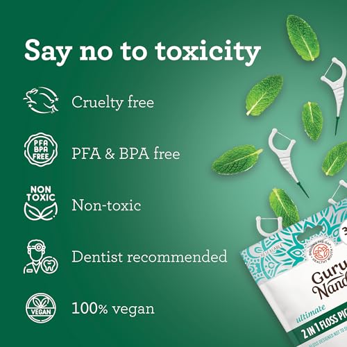NO SHREDDING: GuruNanda 2-in-1 Dental Floss are designed to provide a seamless flossing experience, as they are shred-resistant and will not break midway, ensuring a thorough clean every time. Crafted with high-quality, cruelty-free plastic, our dental floss picks are also PFA & BPA Free, and non-toxic, making them a reliable and safe option for your oral care needs.