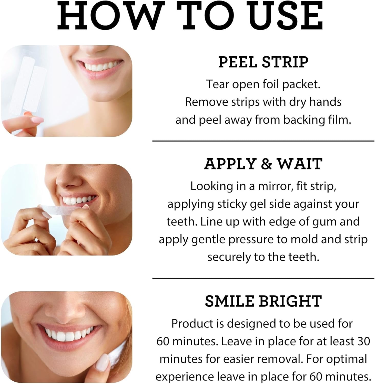 Our strips offer superior adhesion for hassle-free application & stay put for up to 2 hours for effective whiter teeth. For best results, avoid eating, sleeping, or smoking while using the strips.