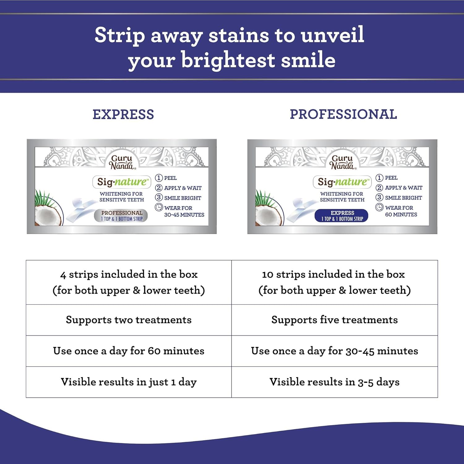 Apply the strips daily for 30-45 minutes & see visible results in 3-5 days. Our kit consists of 14 strips(10 professional, 4 express) for 7 treatments, covering both upper & lower teeth for whitening.