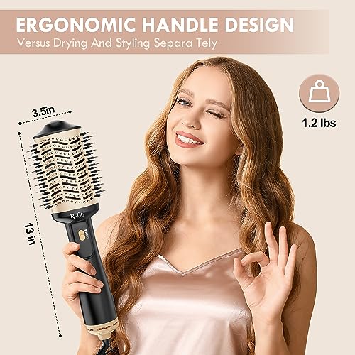 Upgraded hair dryer brush and blow dryer brush in one, the slender handle makes it easier and more comfortable to grip, tufted bristles add extra lift at root to volumize hair. Advanced negative ionic technology lock in moisture to make hair more smooth and shiny. Dry and style in one step, 360° blowout saves at least 50% time. It is also an excellent gift to your mother, lover and friends.