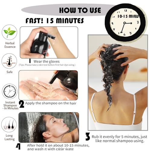 【TIPS & USE STEPS】Please skin test before first using, (Steps: 1.Wear the gloves; 2. apply hair dye shampoo on the wet hair; 3. Rub 5 Mins to color hair evenly; 4. Leave it on for 20-25 Mins(20-25 minutes for best results, Don’t leave more than 30 Mins)). Please massage and rub gently and evenly from the root to the end of the hair to dye all your hair and cover gray hair completely. Refund if you are not satisfied. Contact us freely.