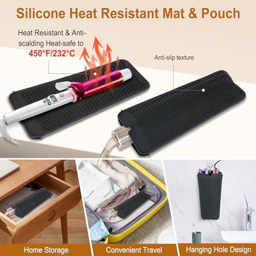 【Heat Resistant Mat & Pouch】This hair tools travel bag comes with a heat resistant silicone mat that is heat-resistant up to 450°F/232℃,prevents your makeup table from burns,it also great for storing hot tools immediately after use,even if it’s still very hot.Suitable for flat iron, curling iron, curling wand, blow dryer and other hot tools.