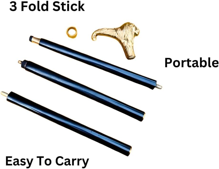 Discover the perfect blend of elegance and functionality with our Handcrafted Black Wooden Walking Stick featuring a striking Golden Brass Lion Head Handle. Designed for seniors and adults, this antique walking cane combines classic style with modern convenience, making it an ideal companion for everyday use or special occasions. Key Features: Elegant Design: This walking stick boasts a luxurious black wooden shaft paired with a magnificent golden brass lion head handle, offering a sophisticated and regal look. Handcrafted Quality: Expertly handcrafted by skilled artisans, each cane reflects exceptional craftsmanship and attention to detail, ensuring a unique and high-quality product. Foldable Convenience: Designed with practicality in mind, this walking stick is foldable, allowing for easy storage and portability. Perfect for travel or on-the-go use. Durable Construction: Made from high-quality materials, this cane is built to last, providing reliable support and balance for daily use. Comfortable Grip: The ergonomically designed lion head handle not only adds a touch of elegance but also ensures a comfortable and secure grip for the user. Standard Size: Measuring approximately 36 inches in length, this walking stick is suitable for most adults, offering an ideal balance of support and convenience. Non-Slip Base: The walking stick is equipped with a non-slip rubber tip at the base, enhancing stability and safety on various surfaces. Versatile Use: Whether for daily walks, outdoor adventures, or as a stylish accessory for formal events, this antique walking cane is a versatile addition to any wardrobe. Perfect Gift Idea: This elegant and practical walking stick makes a thoughtful gift for seniors, collectors, or anyone who appreciates fine craftsmanship and antique design. Embrace the perfect combination of style, comfort, and functionality with our Handcrafted Black Wooden Walking Stick with Golden Brass Lion Head Handle. Enhance your walking experience with a touch of timeless elegance. Order yours today and stride with confidence and grace.