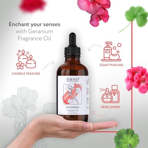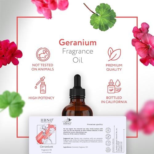 HBNO Geranium Fragrance Oil – Huge 4 oz (120ml) Value Size – Ideal for Soap & Candle Making, Perfumes, Home Fragrances, Reed Diffusers, Bath Bombs, Linen Sprays, Lotions, and Car Fresheners