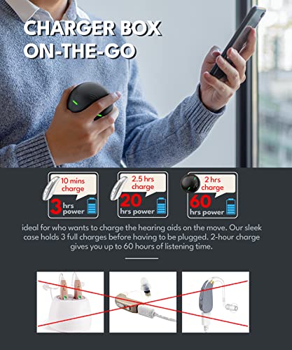Charger case on-the-go, ideal for who has to charge the hearing aids on the move. Portable sleek case holds 3 full charges before having to be plugged. 2-hour charge gives you up to 60 hours of ultra-long listening time.