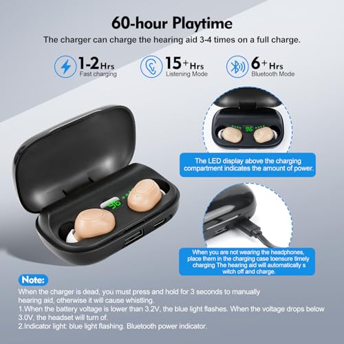 Rechargeable with LED Power Display: Rechargeable hearing aids with lithium-ion battery, can be used for 15 hours when fully charged, the charging case can provide 3-4 times charging for hearing aids, enough to meet the needs of daily life. LED display can always check the remaining power of the charging compartment, so that you can replenish the power of the charging box in time and never worry about the charging compartment suddenly running out of power.