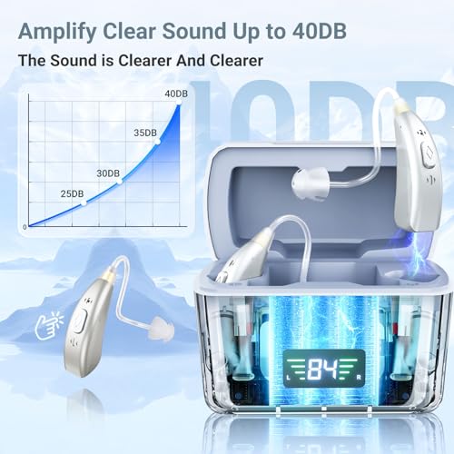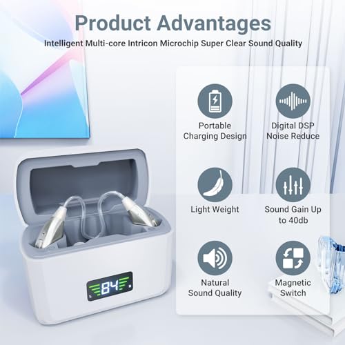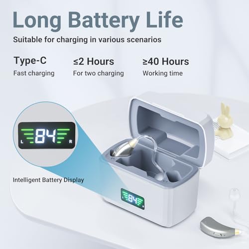 【Digital Display Charging Case】The hearing aids can be used for more than 40 hours. The charging case has 400 hours of reserve power and can charge hearing aids approximately 5 times. The charger has an overcharge protection circuit, so you don’t have to worry about overcharging. There is also a power indicator on the charging case to help you know how much power is left in your hearing aids.