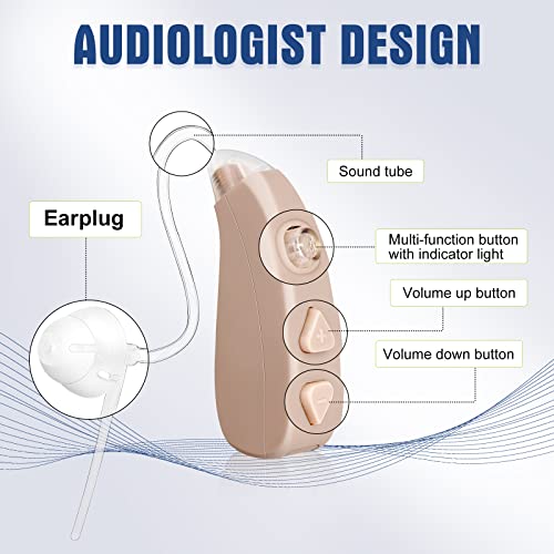 【LIGHTWEIGHT AND COMPACT, COMFORTABLE TO WEAR】This hearing aid is designed to be so light and comfortable that you may even forget you’re wearing it. The ear tips are made of soft and skin-friendly material, comfortable and non-slip, and can be worn for long periods. The invisible sound tube bypasses the top of the ear and hides the hearing aid behind the ear, so it is completely invisible to others and does not interfere with daily eyewear.