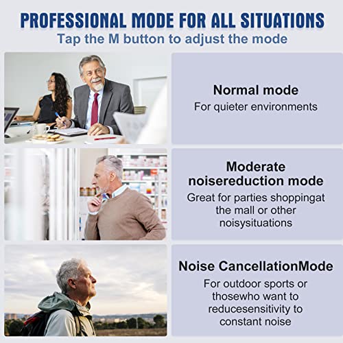 【6 LEVELS OF VOLUME AND 3 MODES, EASY TO ADJUST】 Our hearing aids have 6 levels of volume adjustment to help you better adapt to the environment. Normal mode: Suitable for quiet environments. Moderate noise reduction mode: Ideal for parties, shopping or other noisy situations. Noise cancelling mode: For outdoor sports or those who want to reduce sensitivity to constant noise. To switch modes, press and hold the switch button on the hearing instrument for 1-2 seconds.