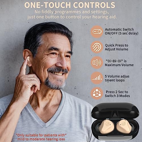 【One Smart-Touch】Squeal-Free Hearing Amplifiers Automatically turn on when take it out of the charging case, turn off when put it back. Quick touch to adjust volume, press 2 seconds to switch mode, long press 5 seconds to turn on/off. Use it for 20 minutes to turn on the memory mode, we will keep your last mode and volume.