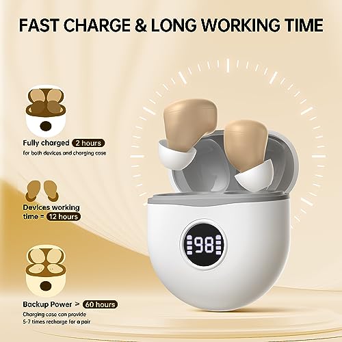 [Intelligent Charging Case With Power Display] – The screen on the charging case can clearly show the remaining power. The charging case can store 60 hours of standby power, which is enough to charge the hearing aids 5-6 times. After each charge, the hearing aids can be used for 12 hours, which is enough to meet your daily needs.