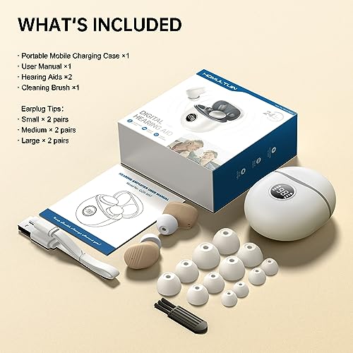 [To Provide You With Quality Service] – In addition to a pair of hearing aids, charging case and instruction manual, there are also some small accessories for you, including 6 pairs of high-quality silicone ear tips in different sizes, a headset cleaning brush and a charging cable. May they accompany you to have a good day.