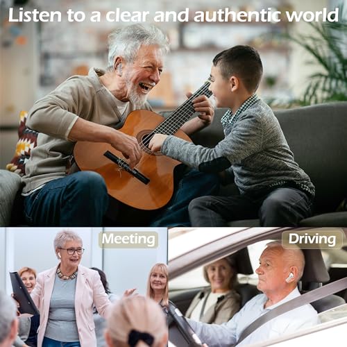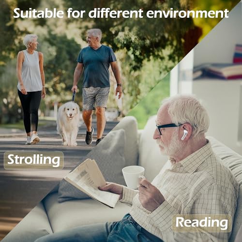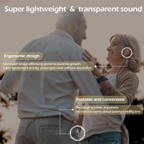 🔬【Ergonomic design】Based on the improvement of traditional hearing aids, the Bluetooth earphone-style appearance is more natural, maintaining confidence in any situation. Weighing about 3.5 grams on each side, it’s ergonomically designed to fit the cochlea better, not-in-ear designs offering almost unnoticeable wear, avoiding discomfort during prolonged use and bacterial infection.