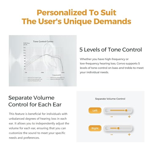 Independent Volume Control And Tone Control: The Trihear Convo supports independent volume control for the left and right ears at 9 different levels, enabling personalized adjustments based on each ear’s unique hearing needs. Offering 5 levels of tone control, allowing customization based on your individual hearing loss and preferences.