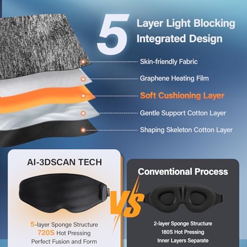 𝐀𝐈-𝟑𝐃𝐒𝐂𝐀𝐍 𝐓𝐄𝐂𝐇’𝐬 𝐋𝐢𝐠𝐡𝐭-𝐛𝐥𝐨𝐜𝐤𝐢𝐧𝐠 𝐒𝐭𝐫𝐮𝐜𝐭𝐮𝐫𝐞: Sleep Mask Utilizes a 5-layer sponge design with superior light-blocking properties, seamlessly formed using 720S heat-pressing technology. This design conforms perfectly to facial contours, particularly around the eyes and nose, achieving an exceptional light-blocking rate of 99%.