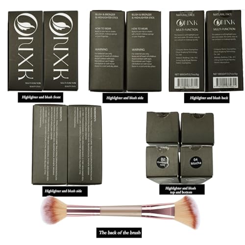 [Multifunctional suit]1 pcs highlighter stick & 1pcs bronzer stick & 3 pcs soft brush makeup kit. It can be used alone or superimposed use. A single tube achieves simple highlights, and superimposed two colors match the naturalness of your skin tone with a shimmering beauty.The double-ended makeup brush realizes highlighting and contouring at the same time.