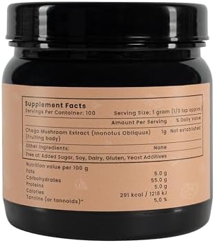 CHAGA EXTRACT with 5% of tannins contains only the best natural ingredients. No artificial ingredients, no fillers, 100% organic mushroom powder extract. The package is 250 gr ( 8.8 oz). Please store the chaga extract with closed lid to keep it fresh and protect from odors. Don’t hesitate to contact us to solve any questions!
