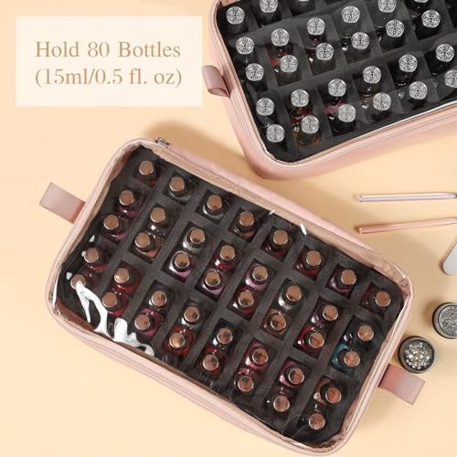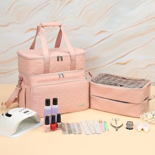 HOMEST Double Layer Nail Polish Organizer Hold 80 Bottles (15ml/0.5 fl. oz) and a Nail Lamp, Nail Polish Case with 2 Removable Pouches, Storage Bag for Manicure Tools, Pink (Bag Only)