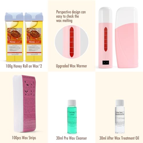 Waxing Kit for Women Men: The waxing kit include 40W pink portable wax warmer for hair removal, 2 honey roll on wax refill, 100 large non-woven wax strips, and 2 bottles of wax treatment oil. Ideal hair removal waxing kit products for women and men.