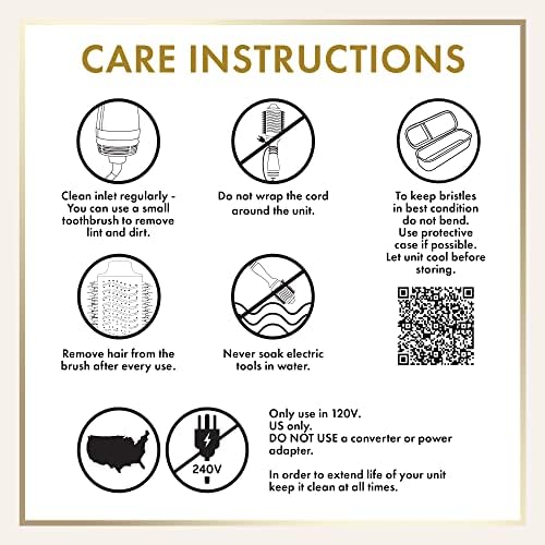 CARE FOR YOUR VOLUMIZER: Clean air inlet regularly, remove hair from the brush after every use and do not wrap cord around the unit. To keep bristles in best condition let unit cool before storing