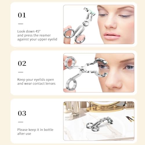 【Usage】 1, look down 45 degrees; 2. Press the tool against your eyelids; 3. Open your eyelids; 4. Put the tools into the box; 5. Clean tools regularly