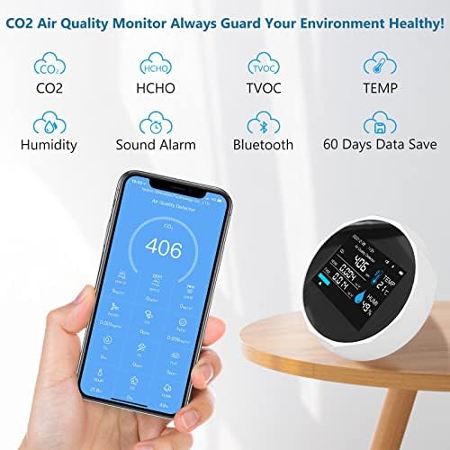 Indoor CO2 Detector, GOLDCHAMP Bluetooth APP Air Quality Monitor, Formaldehyde HCHO TVOC Detector, CO2, Temperature, Humidity Monitoring with Time and Date Display, 5 in 1 Tester for Home Office
