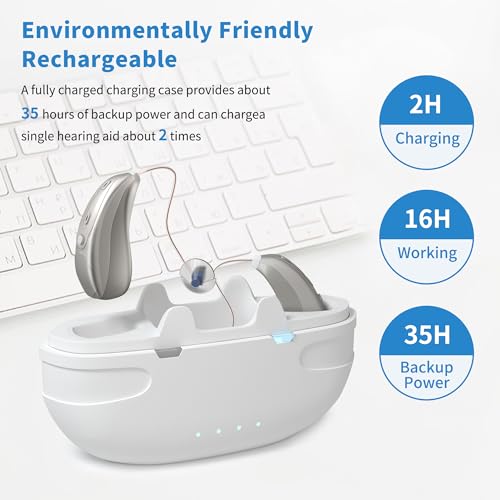 【High Capacity Battery Box】: Rechargeable bluetooth hearing aids have a portable charging base, which can charge the hearing aid at any time. The hearing aid can be fully charged in 2 hours, and it can last for more than 16 hours. The charging base has 35 hours of backup power with an overcharge protection circuit, and it can charge the bluetooth hearing aid 2 times. You can monitor the battery power in real time through the APP.