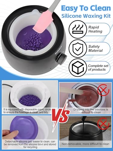 【Easy Clean-Up】Say goodbye to messy clean-up with Kalolary wax set! This Kit not only provide the aluminum pot but also a silicone bowl for easily clean-up the wax residue and recycled for future use. After cooling and solidifying, simply squeeze the sides of the pot and the remaining wax will pop out totally. But please note that, the silicone bowl requires slightly longer heating time than the metal pot, you can choose one of them that best fits your needs for hassle-free hair removal.