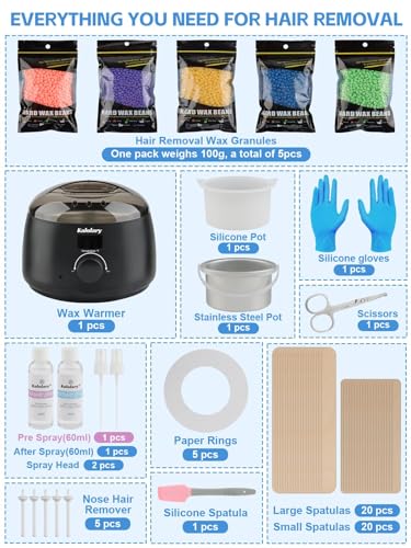 【All-in-One Design】Kalolary hard wax kit includes a digital display wax warmer, 5 packs of hard wax beads, 60ml pre-wax cleaning oil, 60ml after-wax treatment oil, a aluminum pot, a silicone bowl, 20pcs body spatulas, 20pcs facial spatulas, 5pcs nose wax applicators, 5pcs waxing protection collars, one plastic wax spatula& a pair of latex gloves. With all the tools you need for hair removal, help achieve a smooth, hairless skin easily at home without the need for expensive salon appointments.