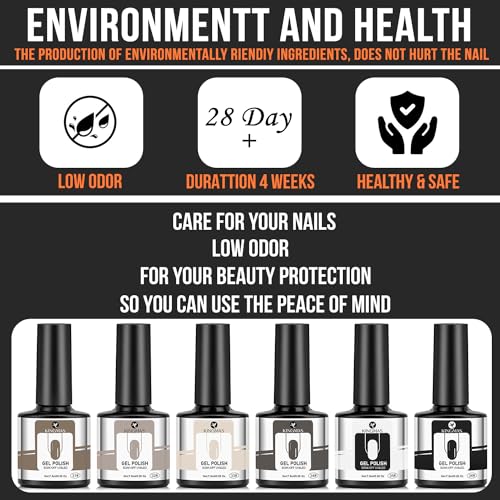 6 COLORS GEL NAIL POLISH SET: 6*7.5ml/0.25oz KINGMAS gel nail polish is specially formulated are made from 9 Toxin Free Ingredient which makes it safe and has low odor. No harsh ingredients or adhesives that lead to damaged nails.