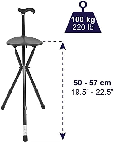 ♥ ADJUSTABLE AND DURABLE: This cane with stool can be height adjusted from 34 to 38 inches, so it can be adapted to the user’s height for greater comfort. The walking stick supports up to 220 lbs thanks to its solid aluminium structure.