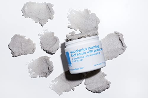 FOOT SCRUB FOR SMOOTH, SOFT FEET: Exfoliating and foaming foot scrub with with granulated pumice that exfoliates; made with a blend of essential oils containing eucalyptus, lemon and lavender in a 4 oz jar