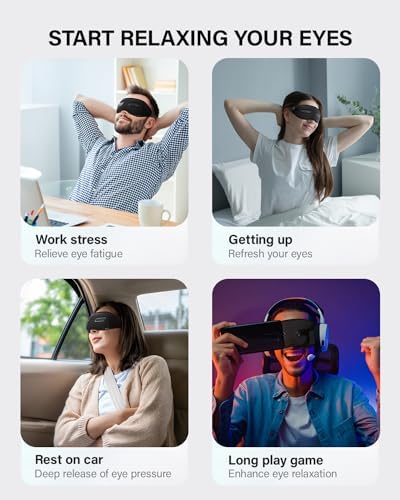 【3D ACUPOINT MASSAGE】 Use our eye massager for migraines to experience precise acupoint trigger point massage. It is equipped with 12 skin-friendly silicone massage heads to cover the acupoints around the eyes, high-frequency bionic point pressure points, like real fingers in the massage. 3 vibration modes + 1 sleep mode, one-touch activation to meet your personalized needs.