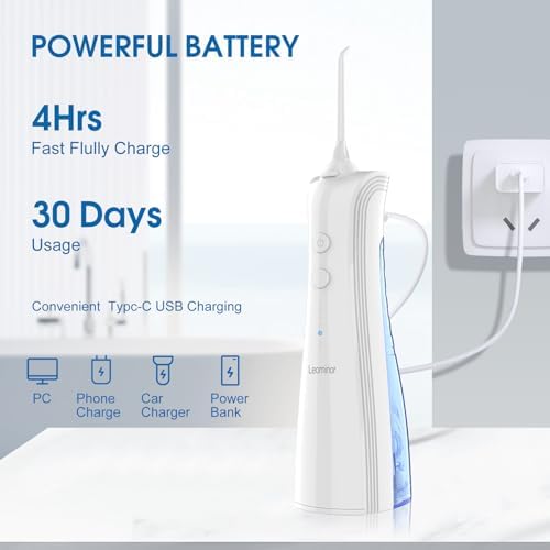 【Portable & Long Battery Life】 With portable size and light weight, Leominor dental flosser brings great convenience to your travels. Adopting 2500Mah Lithium Battery with more Sufficient Power, it is able to be Used Continuously for 15-30 Days with 4-5 hours fully charge. No Hassle to Charge Frequently.