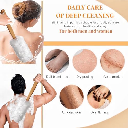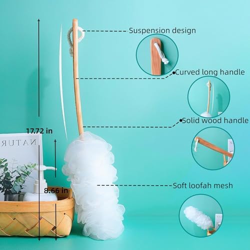 Loofah Back Scrubber for Shower, Large PE Soft Mesh Loofah Exfoliating Body Scrubber with Long Wooden Handle, Bath Shower Sponge Loofah for Men Women, Loofah Bathing Accessories