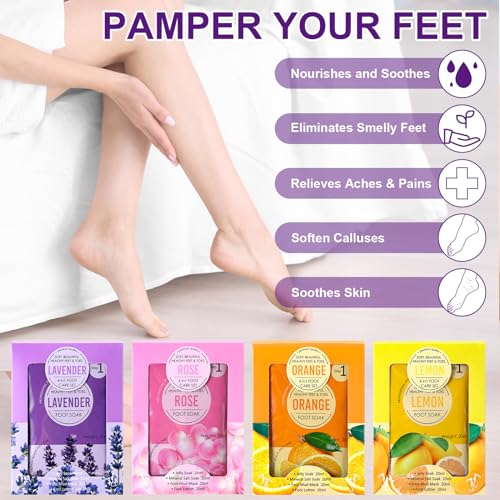 A Rainbow for Your Feet: you will receive 8 box of foot repair pedicure kit, each box contains a bag of foot soak, a foot scrub, a foot mask and a foot lotion, it delivers its magic through four distinct scents; The purple relaxing lavender, the blush of pink roses, the energetic burst of yellow lemons, and the balmy brush of orange citrus; You will have enough quantity and scents to use and share