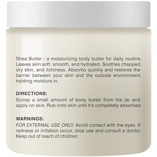 Shea Butter, moisturizing body butter for daily moisturizing routine. Hydrating butter leaves skin soft and smooth. Soothes chapped dry skin and itchiness. Absorbs quickly, restores the barrier between your skin and the outside environment, holding moisture in.