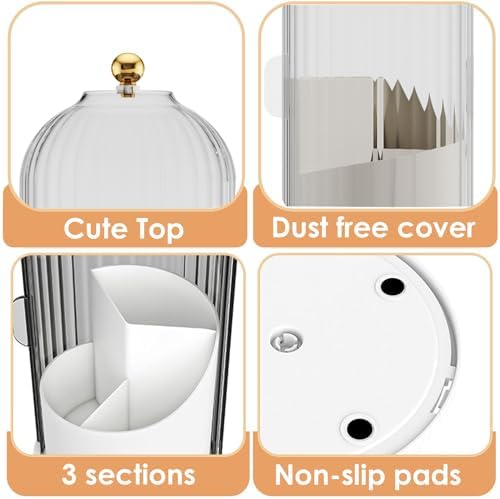 【Rotatable base with protective pad】:360° rotatable base, switchable to your favorite angle for easy use and good-looking placement. Package includes 4 round silicone patches that stick to the 4 support feet on the bottom of the makeup brush organizer to keep it stable.