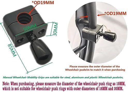 2.Easily attaches to the preexisting wheelchair grip rings; place them anywhere you prefer; fits most manual wheelschairs, please measure the diameter of Wheelchair pushrim at 19MM, it is not suitable for Wheelchair pushrim with outer diameter of 16MM and 20MM.