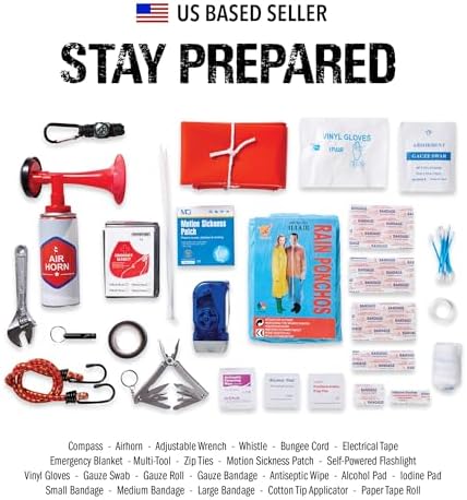 In addition to first aid essentials, this kit also includes an adjustable wrench, bungee cord, compass, motion sickness patch, distress flag, multi-tool, rain poncho, and more.