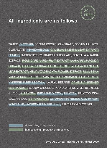 Water, Glycerin, Sodium Cocoyl Glycinate, Sodium Lauroyl Glutamate, 1,2-hexanediol, Camellia Sinensis Leaf Extract, Betaine, Hydroxypropyl Starch Phosphate, Centella Asiatica Extract, Ficus Carica (Fig) Fruit Extract, Laminaria Japonica Extract, Eclipta Prostrata Leaf Extract, Melia Azadirachta Leaf Extract, Melia Azadirachta Flower Extract, Ulmus Davidiana Root Extract, Amaranthus Caudatus Seed Extract, Hydrogenated Lecithin, Lauryl Betaine, Camellia Sinensis Leaf Powder, Sodium Chloride, Polyquaternium-39, Decylene Glycol, Allantoin, Butylene Glycol, Fructan, Fructooligosaccharides, Beta-Glucan, Ceremide NP, Hydrolyzed Hyaluronic Acid, Hydroxyacetophenone, Ethylhexylglycerin