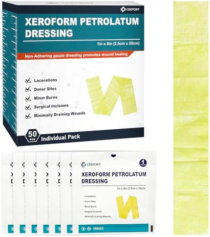 【Individual Packaging】 Ceeport Xeroform Wound Dressing Dressing, measuring 1″ x 8″,50 Individual sterile packages meet medical grade qualifications and can be cut to fit the wound size for easy use anytime. This dressing will be a must-have in home medicine cabinets, hospital pharmacies, schools, sports, hiking trips and more!