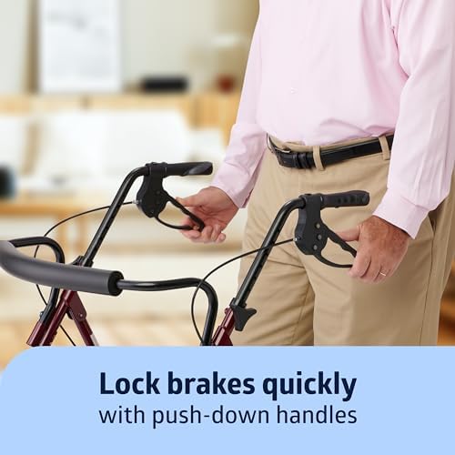 Trusted by healthcare workers and hospitals everywhere, Medline’s extra-wide aluminum rollator walker with padded seat and backrest is the perfect support for the elderly and adults who have mobility impairments. Equipped with 8″ wheels, this value priced rollator easily moves you from indoors to outdoors smoother than ever before. This heavy-duty, foldable rollator features an extra-wide 23.5″ black padded seat. Sturdy burgundy frame weighs only 19 lbs. and can support up to 400 lbs. Convenient spacious under bag storage transports essentials safely and easily. To engage brakes, simply squeeze the easy-grip handles. To keep wheels in a safe, locked position, push grip handles to the down position. This prevents the rollator from moving when standing still, sitting down or standing up. Easily adjust height of handles for your perfect fit from 31.5-37.5″.