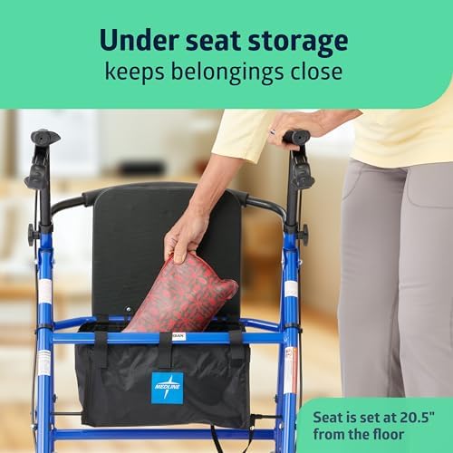 Trusted by healthcare workers and hospitals everywhere, Medline’s steel rollator walker with padded seat and backrest is the perfect support for seniors, adults and elderly, and those who have mobility impairments. Available at a great value, this rollator is equipped with large 8″ wheels to easily move from indoors to outdoors smoother than ever before. Features 12×12″ black padded seat, weighs 19 lbs., supports up to 350 lbs, and comes in a blue steel frame. This walker is great for adults and seniors and those with limited movement ability. Fit with spacious under bag storage, this rollator transports you and your essentials safely and conviently. To engage brakes, simply squeeze the easy-grip handles. To keep wheels in a safe, locked position, push grip handles to the down position. This prevents the rollator from moving when standing still, sitting down or standing up. Easily adjust height of handles 31-35″