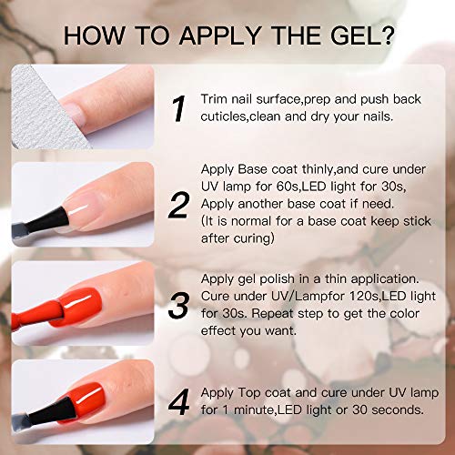 LONG LASTING – Applying according to the instruction, our gel nail polish will last up more then 2 weeks. Super-strong wear, your nail arts will keep no chips or smudges. Always shape a beautiful & confident mood whether we are at work or on a date