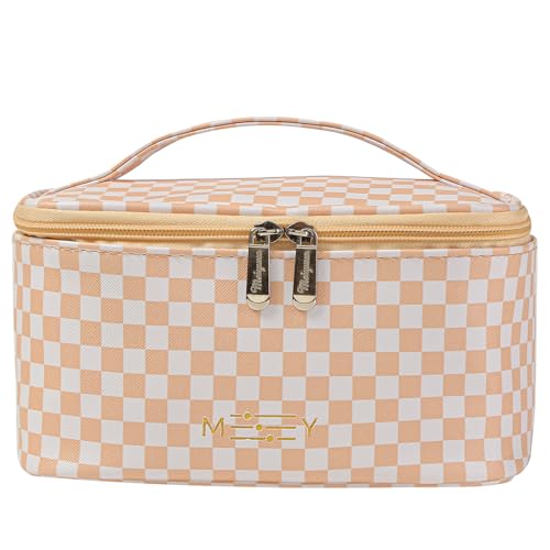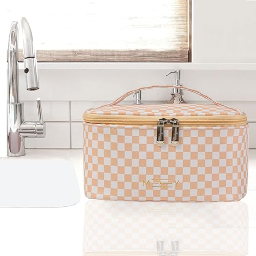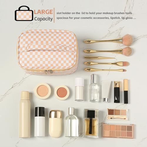 👍VIBRANT COLOR: Peach and whited checkered print design makes it a super cute preppy makeup bag for Ladies, twenties it is simple and lightweight,a secret pal gift at school can hold all your daily basic makeup products securely you need for your . Wide and firm handle for easy carrying