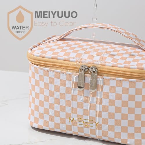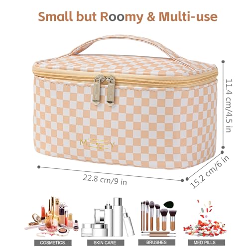 Meiyuuo Travel Makeup Bag Checkered Multi Color Plaid Portable Small Cosmetic Bags for Women Checked Pattern Zipper Pouch Toiletry Bag Make up Organizer Waterproof Cute (Pinkish/Orange Checkered)